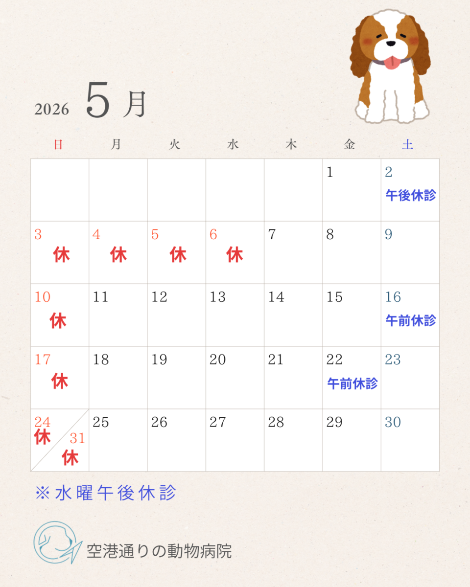 新潟市東区、空港通りの動物病院のお知らせです。 お知らせ 診療スケジュール この記事が気に入ったら いいねしてね! よかったらシェアしてね! URLをコピーしました! URLをコピーしました! 2026年 予防についてのお知らせ 関連記事 2026年 予防についてのお知らせ 2026.03.28 2026年 フィラリア予防のお知らせ 2026.03.28 2026年3月の診察スケジュール 2026.03.02 2月21日(土)・3月7日(土) 午後の臨時休診のお知らせ 2026.02.18 2026年2月の診察スケジュール 2026.02.14 2026年1月の診察スケジュール 2025.12.28 【重要】年末年始の診療スケジュールについて 2025.12.22 ⏰12月22日 臨時休診のお知らせ⏰ 2025.12.22